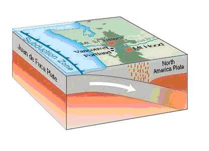 Het ontstaan van diepzeetroggen heeft ook alles te maken met platentektoniek. Hierboven hebben we geleerd dat aardplaten bergen kunnen vormen. Het tegenovergestelde kan ook gebeuren. In plaats van dat de aardplaten elkaar omhoog duwen schuift de ene plaat onder de andere plaat. Dit proces heet subductie. In het plaatje hieronder zie je dat de linkerplaat onder de andere plaat schuift. Op de grens tussen deze twee platen kan een diepzeetrog ontstaan.