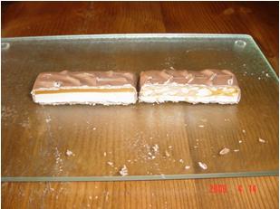 Om het resultaat goed te kunnen bekijken moet je de snicker en de mars in de lengte doorsnijden. Zo kun je de ‘platen’ goed zien (zoals in de bovenstaande figuur). Je drukt de twee repen tegen elkaar en kijkt wat er gebeurt. In de figuur hieronder zie je het resultaat. Je ziet dat snickers een stuk steviger is dan de mars. Met platen gaat dat net zo. De plaat die het dunste is zal het moeten afleggen.