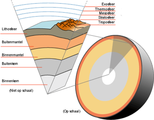 Als je een stuk uit de Aarde zou zagen, dan zou je dit zien. Op deze afbeelding zie je de namen van alle verschillende lagen in de atmosfeer van de Aarde en de namen van de lagen binnenin.