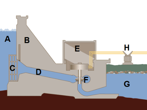 Figuur 2: Schema van een waterloopcentrale. In het stuwmeer (A) wordt het water opgeslagen dat door de stuwdam (B) wordt tegengehouden. Via een rooster (C) dat grote brokstukken (stukken hout of steen, bijvoorbeeld) moet tegenhouden stroomt water door de inlaatpijp (D) met hoge snelheid langs een turbine (F). Die turbine drijft de generatoren in het machinehuis (E) aan. De stroom die deze generatoren produceren wordt door een transformator (H) in stroom met de juiste spanning voor het elektriciteitsnet omgezet, en het gebruikte water stroomt verder naar een opvangbekken of rivier (G).