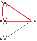 De wandeling over de 7 bruggen van Koningsbergen is niet mogelijk, omdat bij elk punt een oneven aantal lijnen vertrekt. Stel je voor dat we vanuit punt C onze route beginnen, we moeten in dit geval ook weer in punt C eindigen. Als we vanuit punt C naar punt A gaan, vanuit punt A naar Punt B gaan en vanuit punt B naar punt C gaan hebben we al een groot deel van onze route gelopen.
