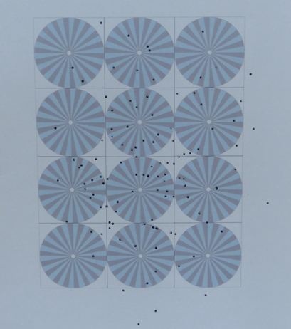 Je ziet het vel dat in het filmpje gebruikt is. Je kunt zelf de gaten tellen die binnen een cirkel vallen en de gaten die buiten de cirkel vallen. Let er daarbij op dat je de gaten die ook buiten de grote rechthoek vallen, niet meetelt.