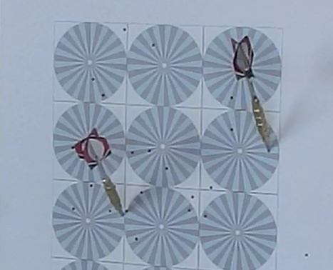 Je ziet dat na 107 pijlen precies de waarde van 3,14 bereikt is. Daar zit een stukje geluk bij, kans is heel groot dat na nóg een keer gooien de waarde weer gaat afwijken. Zie voor de volledige proef het filmpje halverwege dit artikel. Je ziet overigens ook dat de waarde van 3,14 ook al na 42 pijltjes bereikt was. Je zou eeuwig door kunnen gaan met het gooien van darts maar daar word je ook moe van. Het kan daarom handig zijn om een dergelijke berekening ook door de pc te laten doen. Daar lees je meer over in dit artikel.