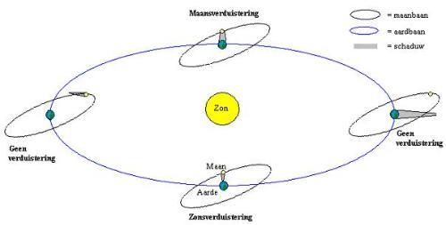 Maar wacht eens even! Als de Maan achter ons staat, blokkeert de Aarde toch het zonlicht? Waarom zien we geen schaduw van de Aarde op de Maan? De reden hiervoor is dat de baan van de Maan om de aarde een beetje scheef staat (zie fig 2). Over het algemeen valt die schaduw dus niet of nauwelijks op de Maan. Maar soms gebeurt het wel dat we een schaduw zien. Dan zit de Maan precies achter de Aarde en op dezelfde hoogte als de Zon. Op de tekening zie je hoe dit gaat. Dit noemt men een maansverduistering.