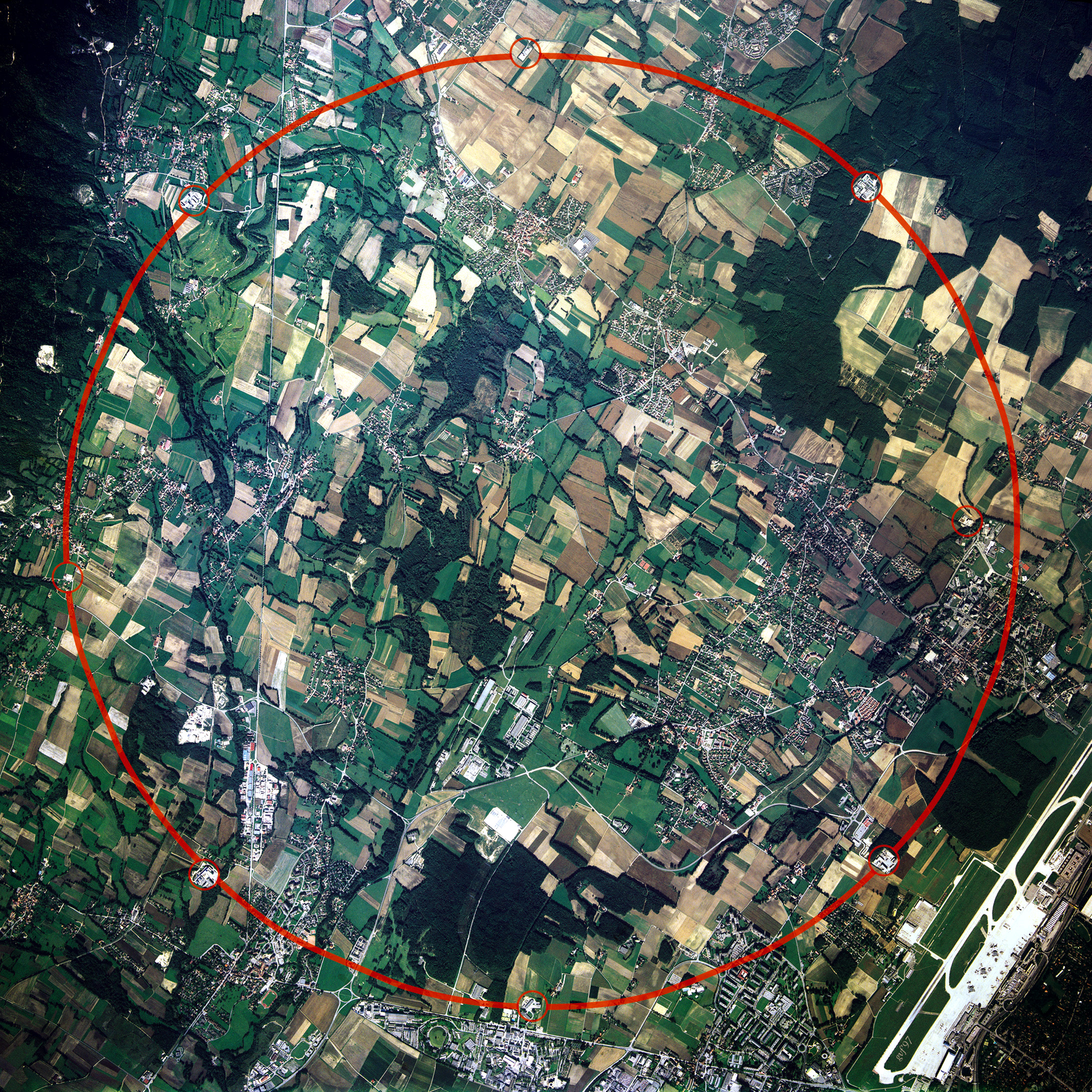De ondergrondse tunnels van de LHC staan met een rode lijn in de foto aangegeven.