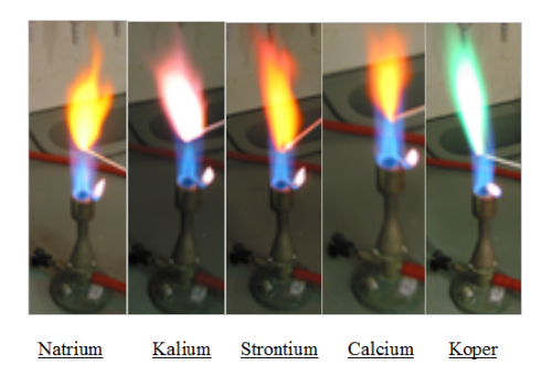 Hierboven zijn de kleuren van een aantal atoomsoorten te zien.Wanneer bijvoorbeeld koperpoeder in het vuurwerk verwerkt wordt, zal dit zorgen voor een groen/blauwe kleur.De reden hiervoor is dat op het moment dat het kruit ontbrandt het koperpoeder sterk verhit wordt. Hierdoor gaan de valentie elektronen (buitenste elektronen van een atoom) in een hogere baan zitten.Wanneer deze in een hogere baan komen, zal het molecuul meer energie bevatten.