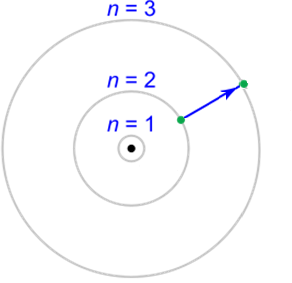 Het model hiernonder geeft een atoom weer met de kern bestaande uit protonen en neutronen. De groene stipjes geeft een elektron weer die naar hogere baan gaat.