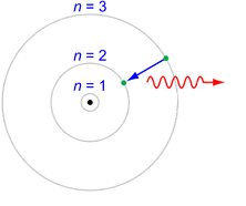 Het model hiernboven geeft wederom een atoom weer met de kern bestaande uit protonen en neutronen. De groene stipjes geeft hier een elektron weer die van een hogere baan terug naar een lagere baan gaat en hierbij een foton (licht) uitzendt. Licht wordt in de afbeelding weergegeven als een golfvorm die je in het rode gedeelte ziet.