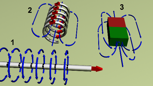 Figuur 1: Een draad waar een stroom doorheen loopt, creëert een magneetveld waarvan de veldlijnen rechts om de draad heen draaien (1). Met behulp van dit principe kun je elektromagneten bouwen: als er een stroom loopt door een spoel (2), draaien de veldlijnen om de spoel heen, op dezelfde manier als de veldlijnen van een normale magneet, die van de de noordpool naar de zuidpool wijzen (3).