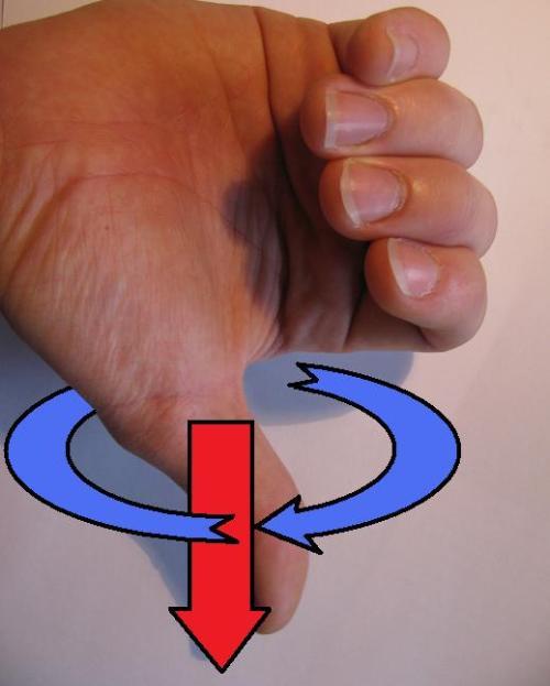 Je kunt deze truc ook met je hand doen: als je je rechterduim opsteekt, en je duim geeft de richting van de stroom aan, dan geven je andere vingers de richting van de veldlijnen aan. (Op deze manier wordt dit dus een rechterhandregel).