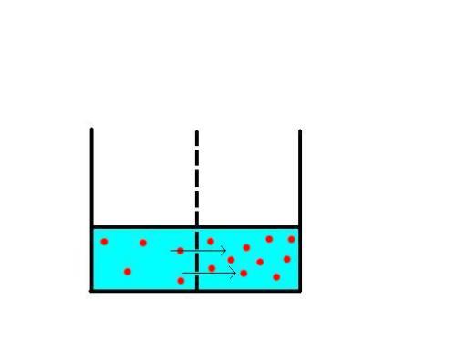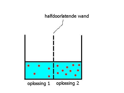 De scheidingswand is een halfdoorlatende wand. Dat betekent dat water er gewoon doorheen kan, maar het zout niet. Doordat de wand halfdoorlatend is gaat er iets bijzonders gebeuren:, het water stroomt naar de kant met de hoogste concentratie zout. Er stroomt dus water van oplossing 1 naar oplossing 2.