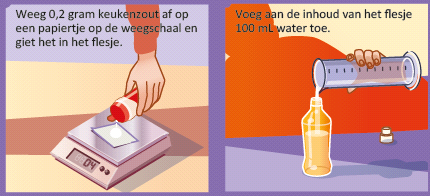 - Weeg 0,2 gram keukenzout af en doe het in het flesje. Bedenk een slimme manier om dit nauwkeurig te doen.