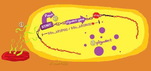 Schema van de genetisch gemodificeerde bacterie. (1) Het bedorven vlees produceert stoffen die door de bacterie gedetecteerd worden. (2) De promotor zorgt ervoor dat het pigmentgen wordt geactiveerd. (3) Pigmentcellen worden geproduceerd, waardoor de bacterie verkleurt.