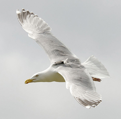Een zilvermeeuw met een gps-logger op zijn rug. De vogels hebben vrijwel geen last van de gps-logger, ze blijven hun natuurlijke gedrag vertonen. Foto: M. Van Kleinwee.