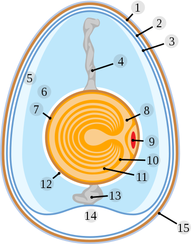 De nummers betekenen het volgende: 1. kalkschaal, 2. schaalhuid, 3. binnenste schaalvlies, 4. chalaza, 5. buitenste eiwit, 6. middelste eiwit, 7. dooiervlies, 8. eidooier, 9. kiemvlek, 10. donkergeel eidooier, 11. lichtgeel eidooier, 12. binnenste eiwit, 13. chalaza, 14. luchtkamer, 15. Cuticula. Als je meer over de opbouw van een ei wil weten kan je op Wikipedia kijken.