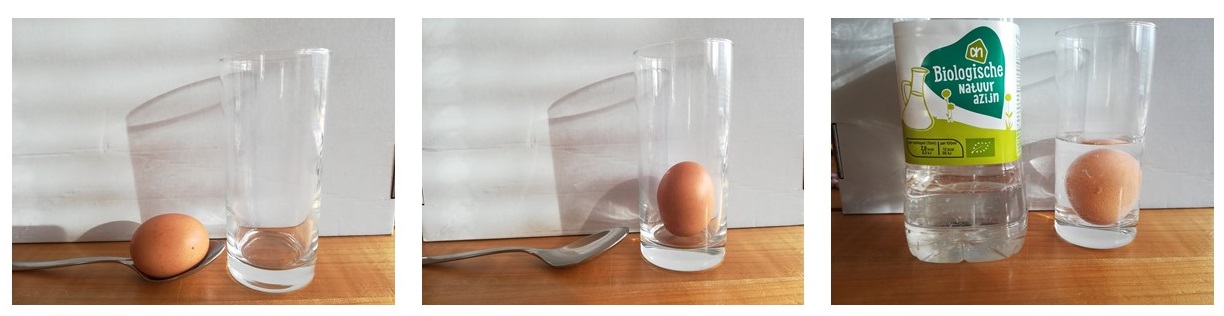 Daarvoor doe je het volgende: neem een ei en een fles (goedkope) azijn. Leg het ei voorzichtig in een glas of een jampot. Je kunt daarvoor eventueel een lepel gebruiken als je bijvoorbeeld een hoog glas hebt. Giet er daarna azijn over zodat het ei gaat zweven. Dat is op zich grappig, want in water zou het ei zinken, maar omdat azijn een grotere dichtheid heeft, blijft het ei daarin zweven. Als je wilt weten hoe dat zit, lees dan het artikel over de luchtballon.