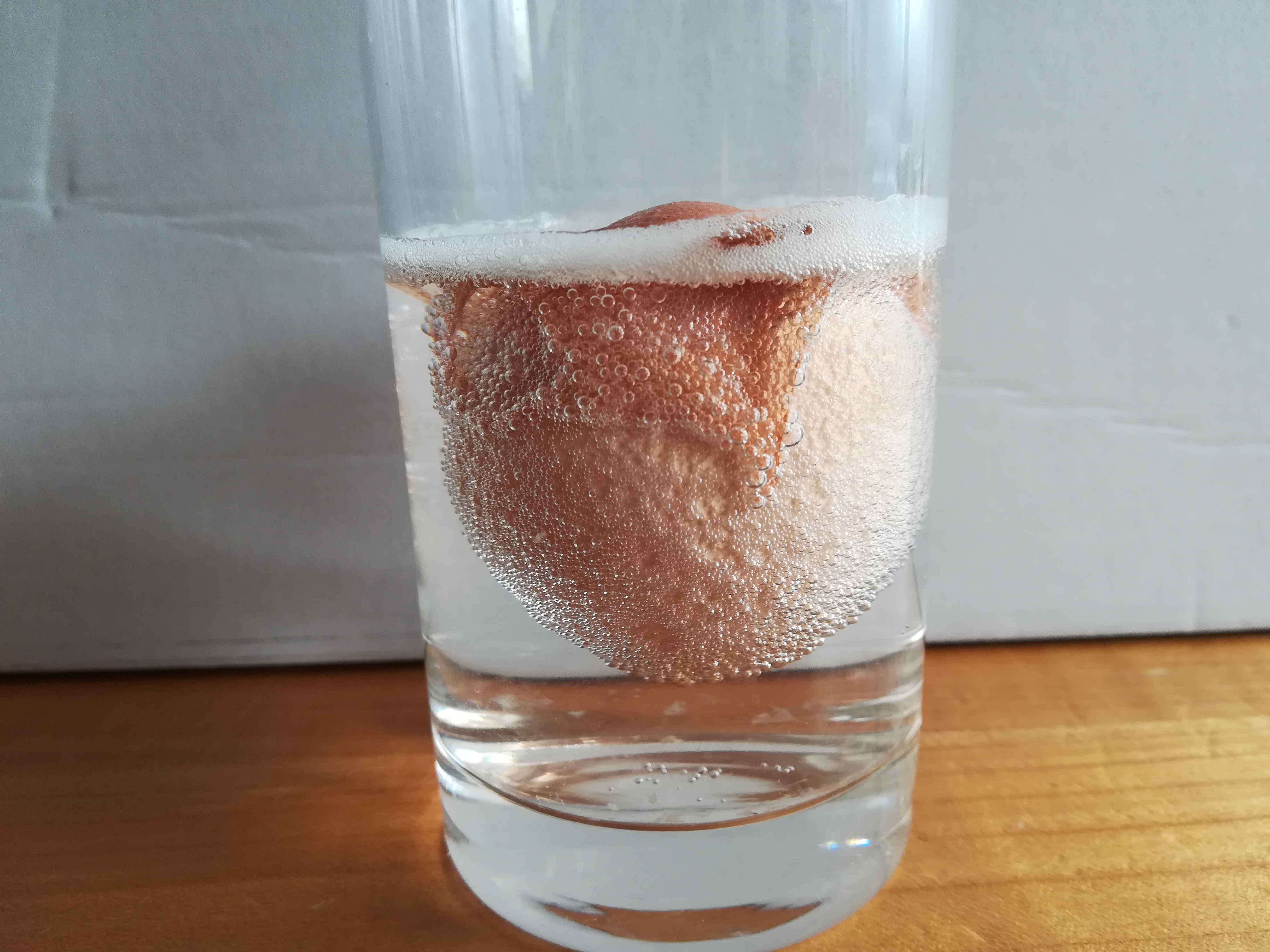 Al na korte tijd zie je een duidelijk reactie. Er ontstaan allemaal belletjes op het ei. Dat komt omdat het zuur van de azijn het calciumcarbonaat (dat is kalk) oplost. Daarbij ontstaat koolzuurgas en dat zie je als belletjes aan het ei plakken.