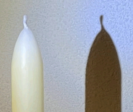 De schaduw heeft dezelfde vorm als de kaars. Het zou je ook nog kunnen opvallen dat het schaduwbeeld (vrijwel) even groot is als de kaars zelf. (Dat komt omdat de kaars dicht voor het scherm staat. Als de kaars verder van het scherm afstaat is het beeld groter.)