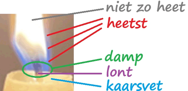 Waarom geeft een vlam eigenlijk licht? Beintema schrijft: “De vlam van de lont laat kaarsvet verdampen. De gasvormige brandstof reageert nu vanzelf met zuurstof en daarbij komt nieuwe warmte vrij, die meer brandstof doet verdampen, enzovoort. Er komt dus ook licht vrij, in verschillende kleuren. Het blauwe licht, aan de basis van de vlam en in een flinterdun schilletje om de hele buitenkant ervan is het heetst: vaak wel zo’n 1400 graden Celsius. (…) Een groot deel van de vlam is echter minder heet, en geeloranje. Dit komt doordat de verbranding in het midden van de vlam onvolledig is vanwege zuurstofgebrek.”
