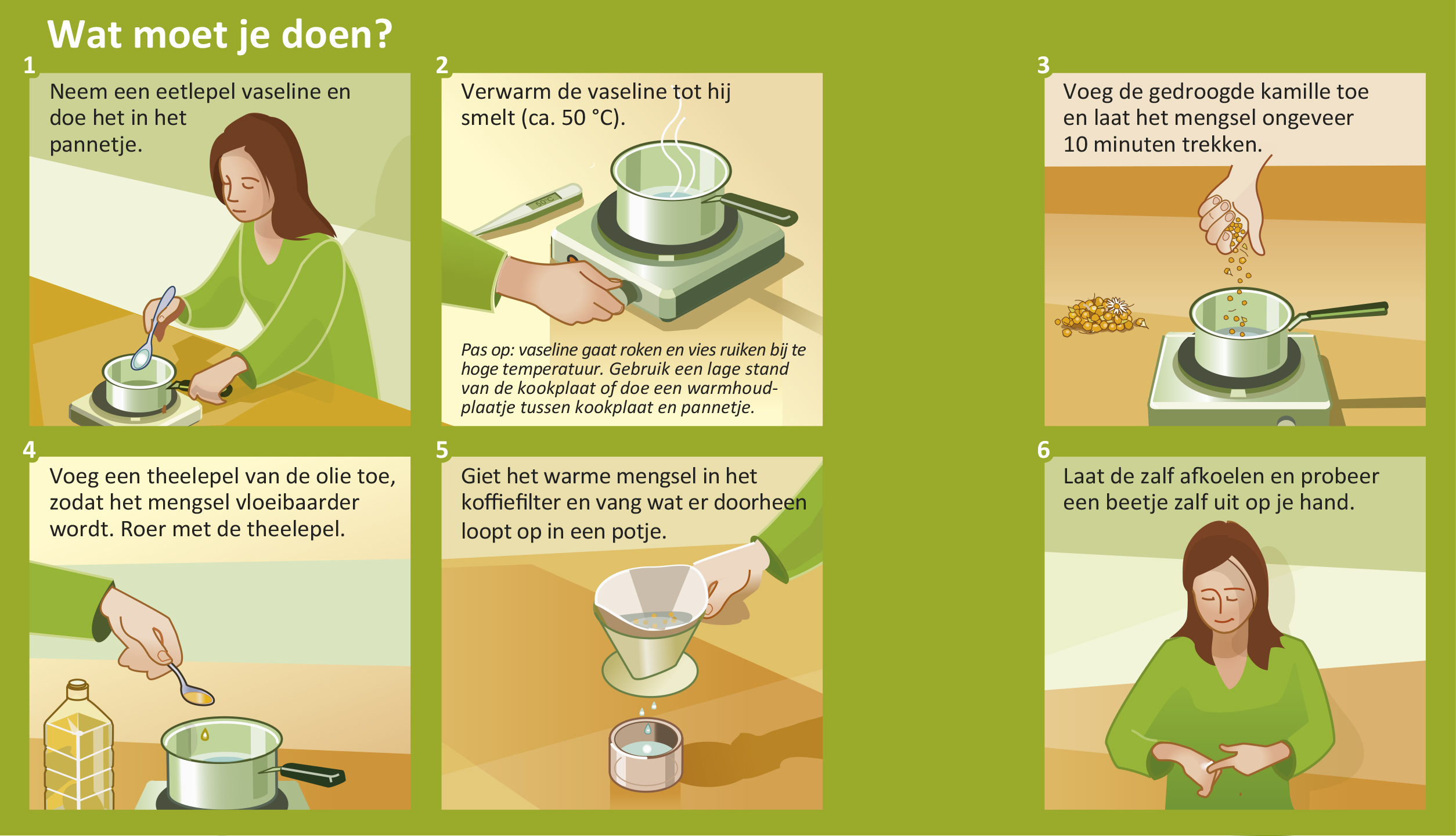 Eventueel kun je een paar druppels kleurstof (voor voedingsmiddelen) toevoegen om jouw zalf een mooi kleurtje te geven. Je kunt ook andere kruiden gebruiken (bijvoorbeeld goudsbloem in plaats van kamille) en je kunt de kruiden ook heel fijn malen en dan in