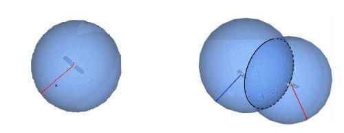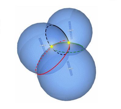 Een tweede satelliet geeft wederom een heleboel extra informatie. In bovenstaande figuur zie je naast elkaar de mogelijke posities voor één en voor twee satellieten. Je kunt rechts in de figuur zien dat er nu van die grote bol alleen nog maar een stippellijntje over is. Dit zijn de contactpunten van de twee bollen.