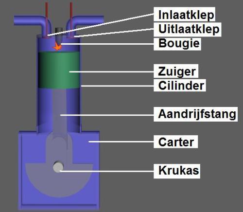 In figuur 1 kun je zien uit welke onderdelen een viertaktmotor bestaat. In het filmpje zie je hoe een viertaktmotor werkt.Een viertaktmotor is een zogenaamde verbrandingsmotor. Dat wil zeggen dat het een motor is die draait omdat er brandstof verbrand wordt. In het geval van een viertaktmotor is dat meestal benzine, maar diesel komt ook voor. De brandstof wordt in de vorm van een nevel (vele kleine druppeltjes) in de cilinder van de motor gespoten en daar door een vonk aangestoken. De brandstof ontploft dan en duwt de zuiger dus weg.
