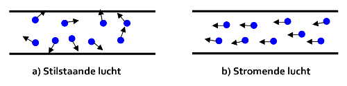 Tot nu toe ging het over een vloeistof of gas dat (op het oog) niet lijkt te bewegen. Wat gebeurt er als het geheel in beweging is? Neem als voorbeeld lucht in een buis. Als deze lucht stilstaat bewegen de moleculen willekeurig heen en weer en veroorzaken ze een bepaalde druk. Wanneer de lucht echter stroomt, gaan de moleculen allemaal min of meer in dezelfde richting. Hierdoor botsen ze minder vaak en hard op de wand van de buis. Dit betekent dat de druk lager is bij een stromend gas. Hoe hoger de snelheid, hoe lager de druk!