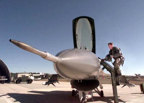 De Pitotbuis van een F-16-straaljager bevindt zich op de neus.