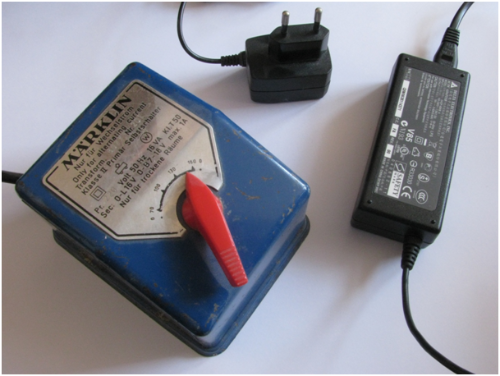 Figuur 1: Verschillende transformatoren: de oplader van een mobieltje, de adapter van een laptop en een oude transformator voor een modelspoorbaan.