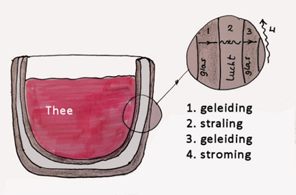 b) Welke soorten warmteoverdracht vinden er plaats van binnen naar buiten, bij de glazen theebeker?