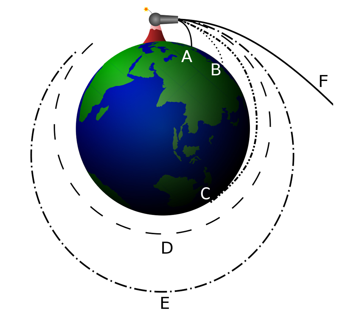 Als je harder schiet, dan komt hij verder weg. Schiet je nog harder, dan krijg je op een gegeven moment dat de baankogel nog wel wordt afgebogen door de zwaartekracht, maar omdat de Aarde rond is gaat dat niet meer snel genoeg om de kogel weer terug op het oppervlak te krijgen. Kijk maar eens op het plaatje, baan D. De baan buigt af, maar het Aardoppervlak ook! Daardoor kan zo'n kogel in theorie voor eeuwig rondjes blijven draaien.