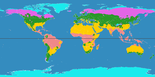 Op deze wereldkaart is aangegeven in welke gebieden wat voor klimaat heerst. De zwarte lijn stelt de evenaar voor. Zoals je ziet, komt het tropisch klimaat vooral voor rond de evenaar. Een droog klimaat heerst vooral in de "gordels" noordelijk en zuidelijk van die tropische zones, en nog verder bij de evenaar vandaan vind je gematigde klimaten en landklimaten. Rond de noord- en zuidpool heerst er een poolklimaat.