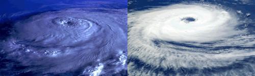 Orkanen: In de afbeelding hierboven zie je twee voorbeelden van een tropische cycloon. De linker cycloon wordt Elena genoemd, en vond plaats rond 1 september 1985 in de golf van Mexico. De rechter cycloon is Catarina. Deze cycloon trof eind maart 2004 de kust van Brazilië.