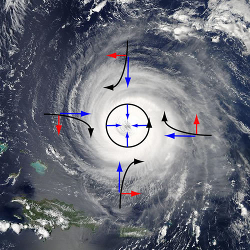 Krachten: Voorbeeld van een orkaan op het noordelijk halfrond. De blauwe pijlen zijn getekend richting het lagedrukgebied: ze geven aan waar de lucht heen zou stromen als het Coriolis effect er niet zou zijn. De rode pijlen geven de richting van het Coriolis effect aan en de zwarte pijlen de richting van de uiteindelijkeluchtstromen.