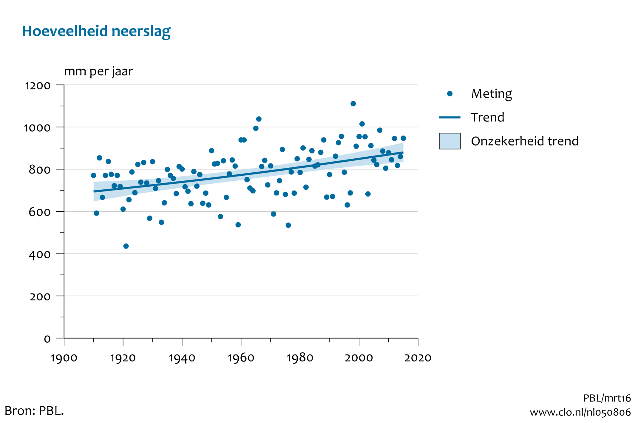 Over het verloop van de tijd is de hoeveelheid neerslag in Nederland langzaam toegenomen. Het is de verwachting dat deze trend zich voortzet. In onderstaande figuur kun je dat duidelijk zien. De toename is niet heel spectaculair maar wel goed herkenbaar.